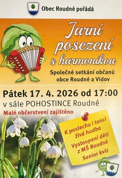 Obec Roudné zve zájemce z Vidova v pátek 17.4. od 17:00 do Pohostince v Roudném na posezení s harmonikou. K tanci a poslechu zahraje živá hudba, vystoupí děti z MŠ Roudné a připraven je i senoirský kvíz a malé občerstvení.