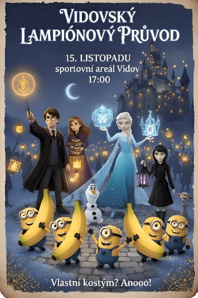 Lampiónový průvod se uskuteční v sobotu 15.11. 2025. Sraz a začátek průvodu je v pergole ve sportovním areálu. Průvod vyrazí v 17:00, okruh meří cca 1 000m. Letošní průvod je ve znamení dětských filmů LEDOVÉ KRÁLOVSTVÍ, MIMONI, HARRY POTTER a WEDNESDAY. Po splnění lehkých úkolů děti dostanou drobné odměny. K dispozici bude teplý čaj a buřty zdarma, které si budou moci zájemci opéct na ohni po skončení průvodu. Vlastní kostýmy vítány. Těšíme se na vás!!!