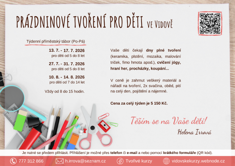 Příměstské týdenní tábory s tvořením pro děti a prázdninové tvoření pro děti od 5 do 15 let ve Vidově budou probíhat ve Spolkovém domě č.p. 168 a v přilehlém sportovním areálu. Program je zajištěn od 8 do 15:00. Vaše děti čekají dny plné tvoření (keramika, plstění, mozaika, malování