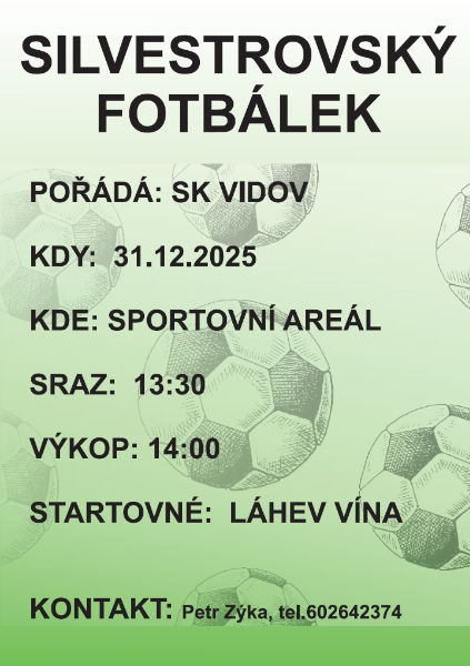Na Sillvestra 31.12. proběhne ve sportovním areálu tradiční fotbalové klání. Výkop ve 14:00, sraz ve 13:30. Startovné je lahev vína. Kontaktní osoba: Petr Zýka - 602642374.